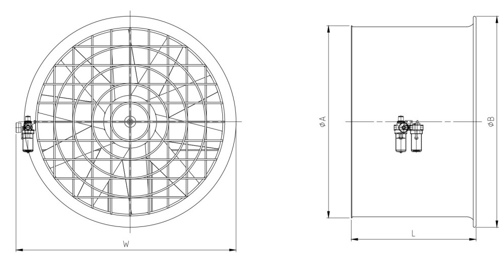 氣動風扇具備防(fáng)爆功能,是一款以壓(yā)縮空氣為動力源;采用(yòng)氣動馬(mǎ)達作為動力(lì)裝置的抽、排風機,用於(yú)化學藥品工廠、飛機工廠、造船廠、塗裝展台、成(chéng)套設備、防(fáng)爆地區等。因為不使用電,所以沒有火(huǒ)花、等危險(xiǎn)性。空氣軟管(guǎn)輕鬆快接,打開閥門即可啟動使用。